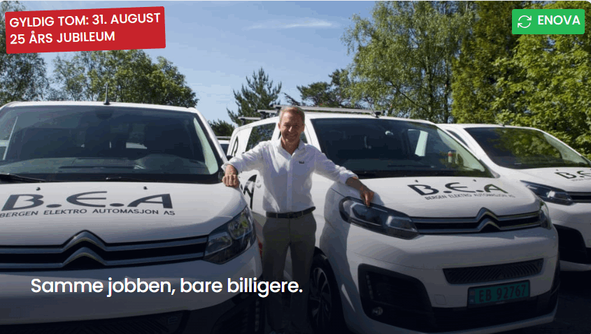BEA feirer sitt 25 års jubileum. Bestill elektriker innen 31. August 2025 å få 25% rabatt på alt materiell.